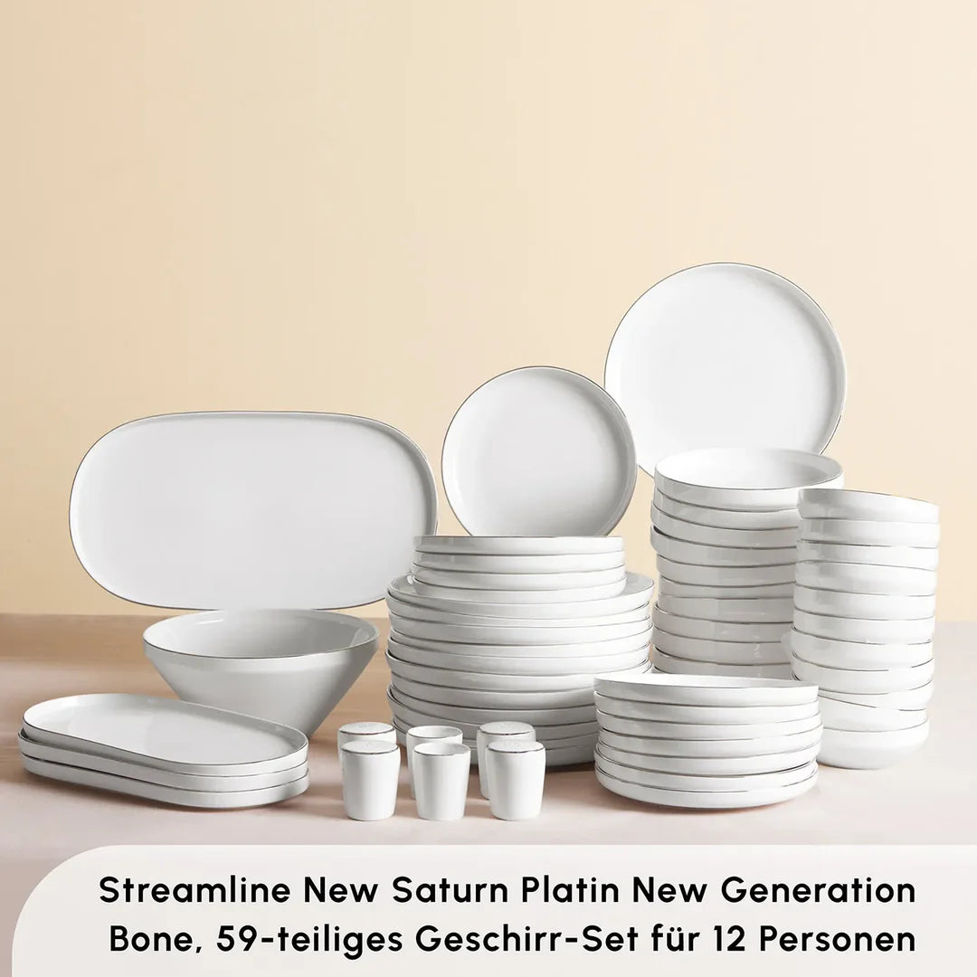 Das Red Carpet Collection Streamline New Saturn Platinum Geschirrset, 59-teilig besticht durch sein elegantes Design und hochwertige Verarbeitung. Gefertigt aus New Generation Bone Porzellan, bietet es eine edle Platinverzierung, die jeden Tisch aufwertet. Das Set umfasst 12 Essteller (27 cm), 12 Suppenteller (19 cm), 12 Dessertteller (22 cm), 12 Schüsseln (14 cm), 3 kleine Servierplatten (31 cm), 1 grosse Servierplatte (38,5 cm), 2 Salzstreuer, 2 Pfefferstreuer, 2 Zahnstocherhalter und 1 grosse Schüssel (23 cm). Bitte beachten Sie, dass das Geschirr nicht mikrowellengeeignet ist und Handwäsche empfohlen wird, um die Platinverzierung zu erhalten. Ersatzteile sind verfügbar.