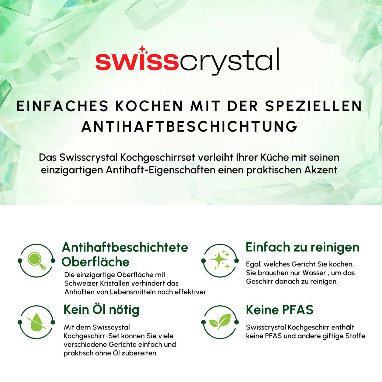 Die SwissCrystal-Antihaftbeschichtung, hergestellt mit echten Schweizer Kristallen, sorgt für maximale Hitzebeständigkeit, hervorragende Antihaft-Eigenschaften und müheloses Kochen – ganz ohne Öl oder Fett.