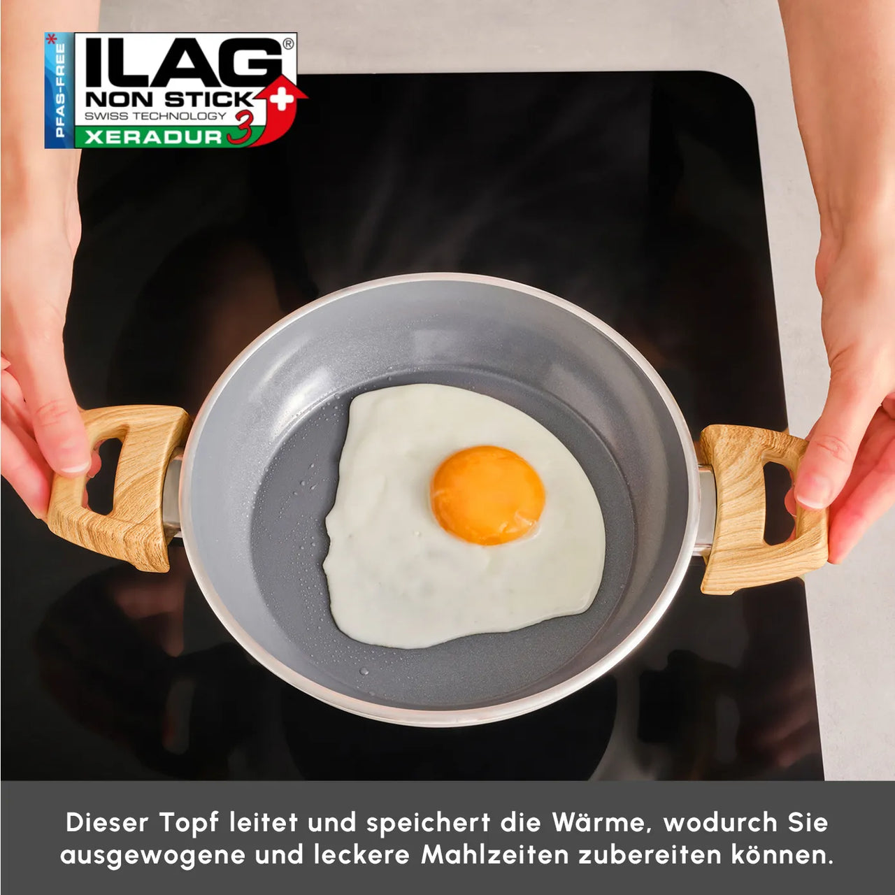 Diese fortschrittliche Beschichtung ist PFAS-frei und enthält keine gesundheitsschädlichen Chemikalien. Dank der gleichmäßigen Wärmeverteilung gelingen alle Gerichte – von Eiern über Fisch bis hin zu zartem Hähnchen – perfekt.