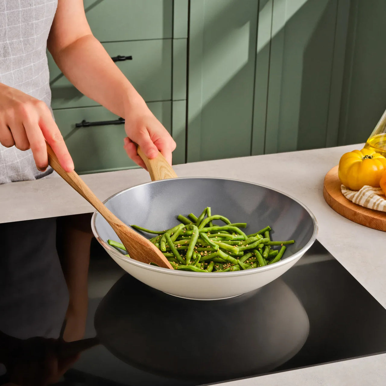 Dank der tiefen Wok-Form ist sie ideal zum Braten, Dünsten oder Frittieren geeignet – perfekt für asiatische Gerichte, Gemüsepfannen, Fleisch oder Fisch.