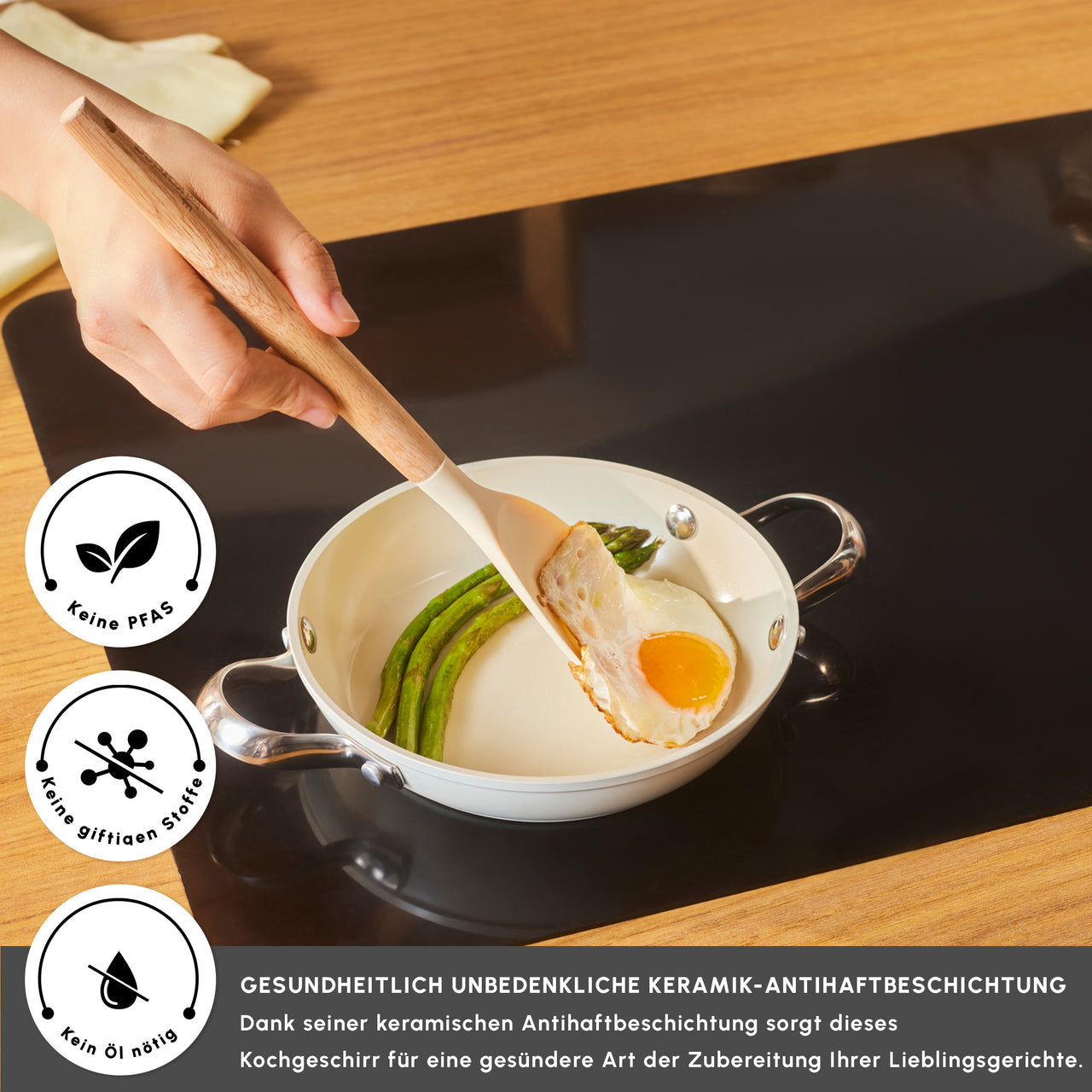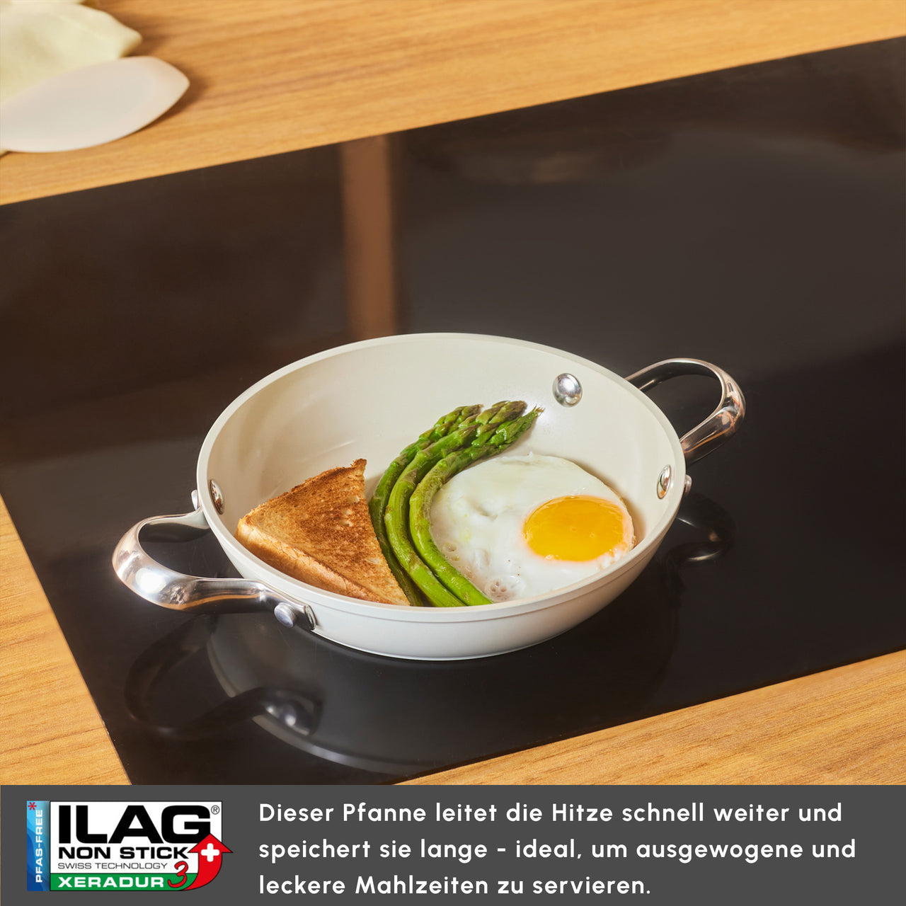 Erleben Sie entspanntes Braten mit Stil – die Karaca Swiss Crystal Almond Cream Pfanne mit Ø 18 cm verbindet moderne Eleganz mit hochwertiger Technik und sorgt für müheloses Kochen ohne Anhaften.