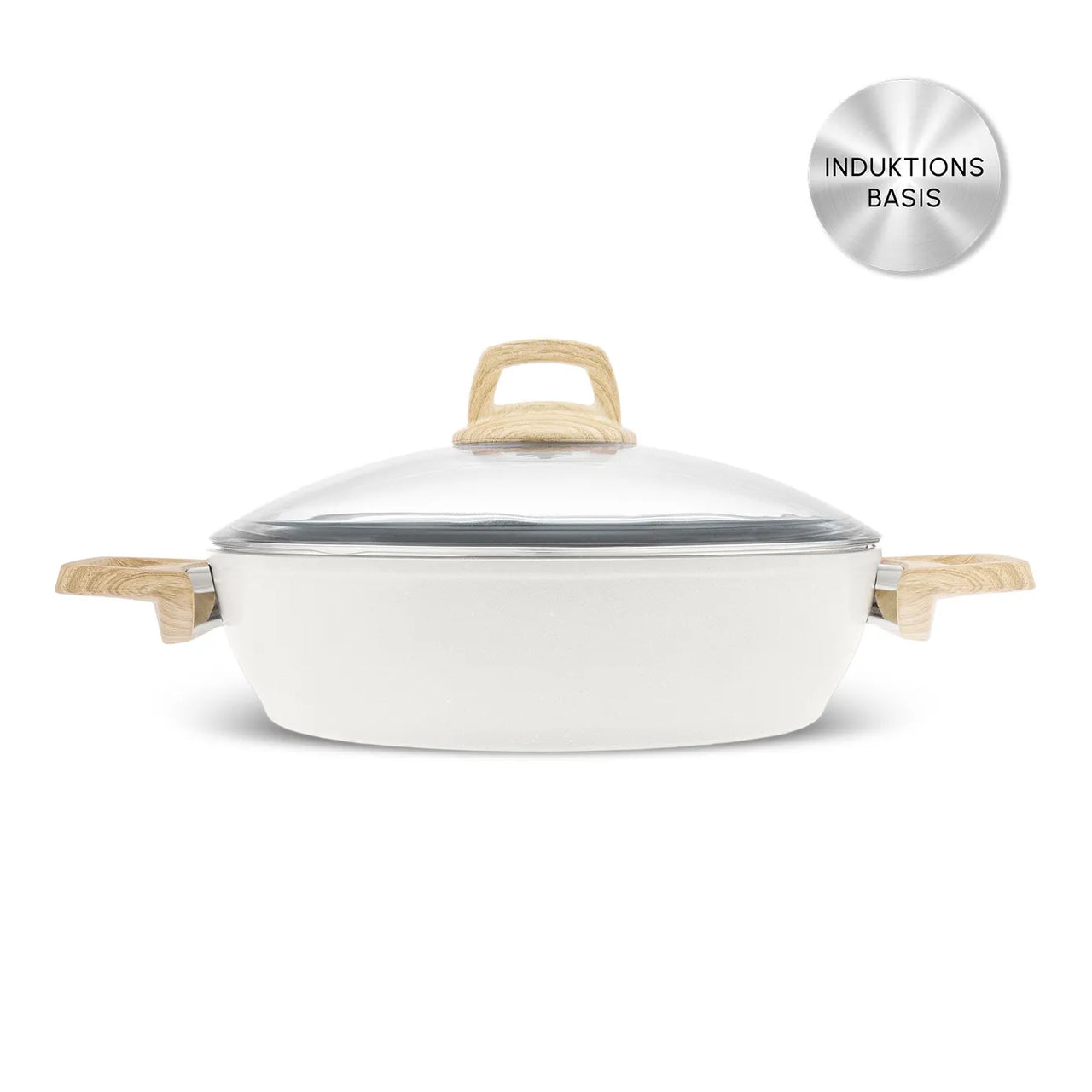 Dank der flachen Bauweise ermöglicht dieser Topf eine besonders gleichmäßige Wärmeverteilung und ist ideal zum Braten, Schmoren oder Dünsten geeignet. Zudem ist er induktionstauglich und spülmaschinenfest, was maximale Flexibilität im Alltag bietet.