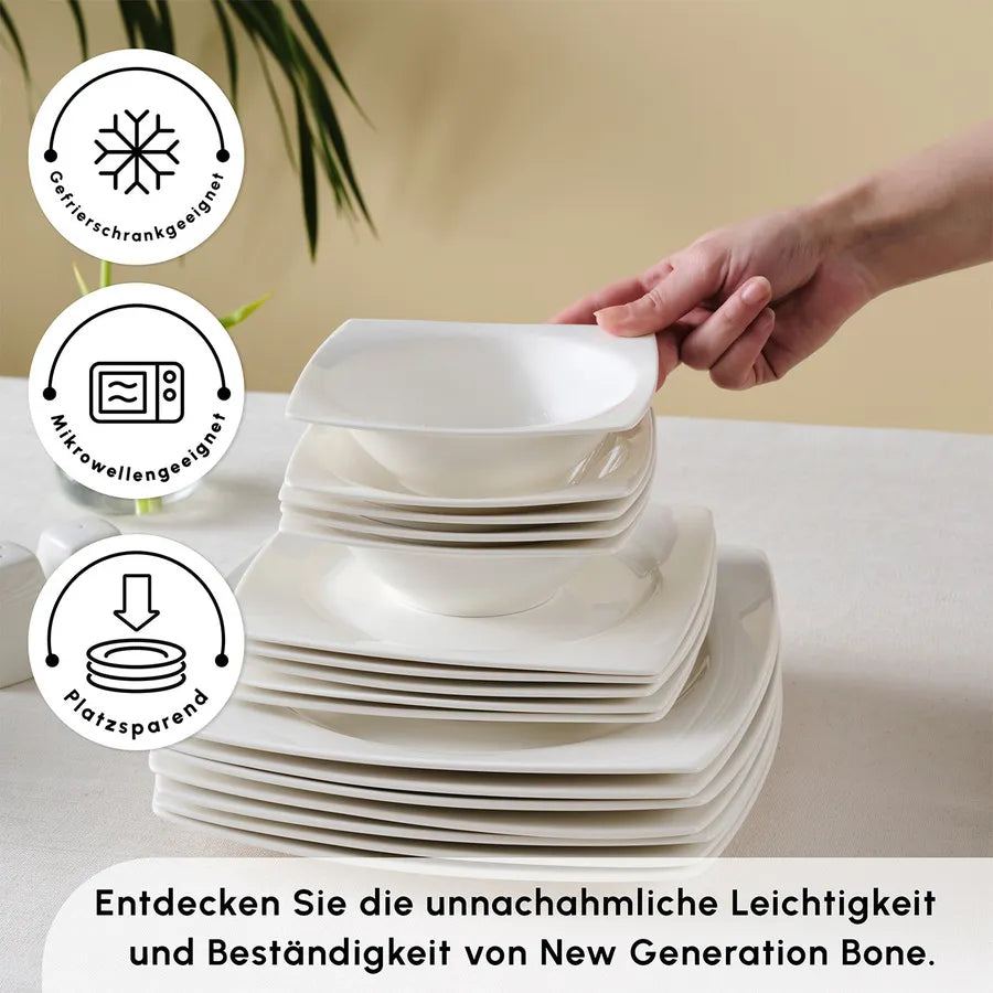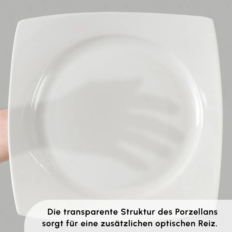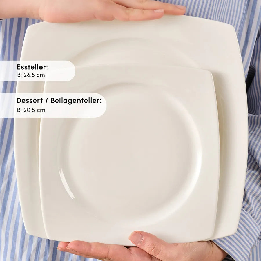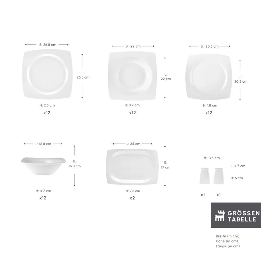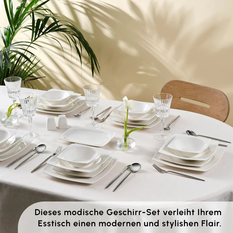 Das Square Bone Jamie White Geschirrset bringt moderne Eleganz auf Ihren Tisch. Mit 52 Teilen für 12 Personen ist es ideal für große Familien und stilvolle Dinnerpartys. Das Set besteht aus hochwertigem neuem Knochenmaterial und zeichnet sich durch seine kantige, moderne Formgebung in reinem Weiß aus. Es ist spülmaschinengeeignet, wobei eine schonende Reinigung bei niedrigen Temperaturen empfohlen wird. Seine kratzfeste, abriebfeste und langlebige Oberfläche macht dieses Geschirrset zu einem verlässlichen Begleiter im Alltag. Perfekt für alle, die stilvolles Design mit funktionaler Qualität verbinden möchten.