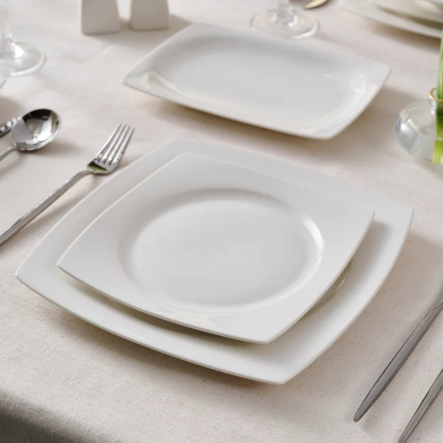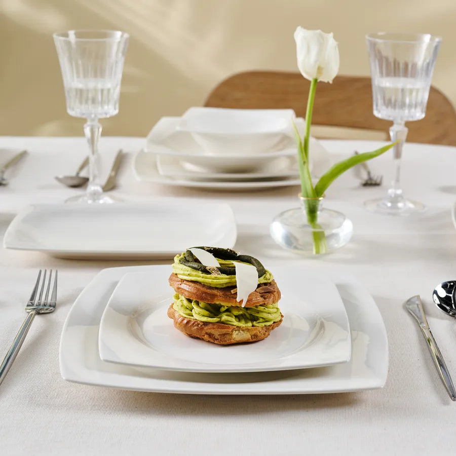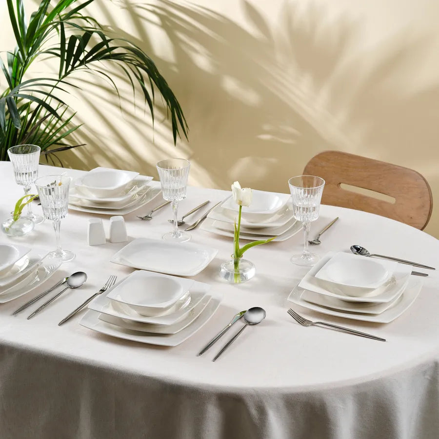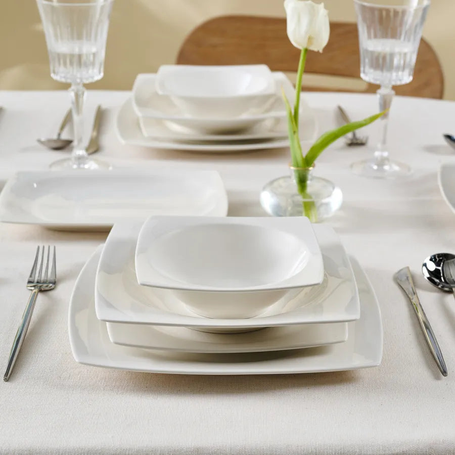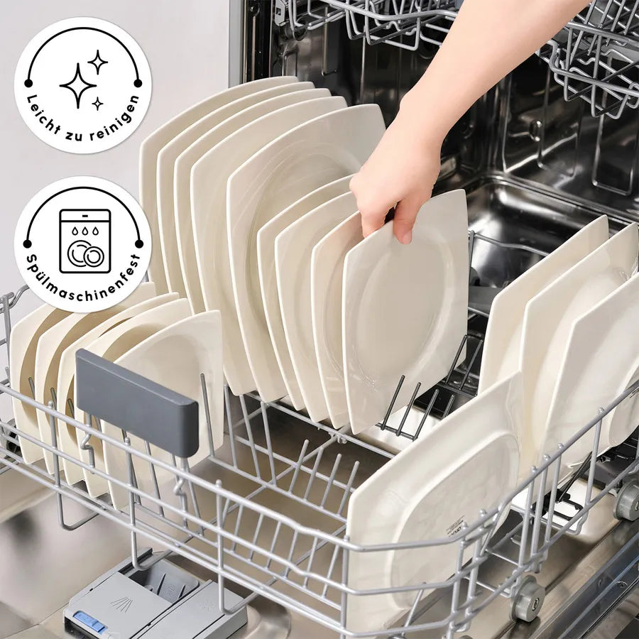 Das Square Bone Jamie White Geschirrset bringt moderne Eleganz auf Ihren Tisch. Mit 52 Teilen für 12 Personen ist es ideal für große Familien und stilvolle Dinnerpartys. Das Set besteht aus hochwertigem neuem Knochenmaterial und zeichnet sich durch seine kantige, moderne Formgebung in reinem Weiß aus. Es ist spülmaschinengeeignet, wobei eine schonende Reinigung bei niedrigen Temperaturen empfohlen wird. Seine kratzfeste, abriebfeste und langlebige Oberfläche macht dieses Geschirrset zu einem verlässlichen Begleiter im Alltag. Perfekt für alle, die stilvolles Design mit funktionaler Qualität verbinden möchten.