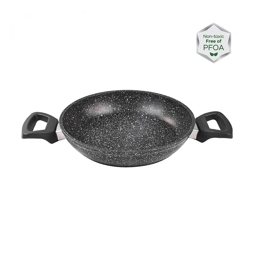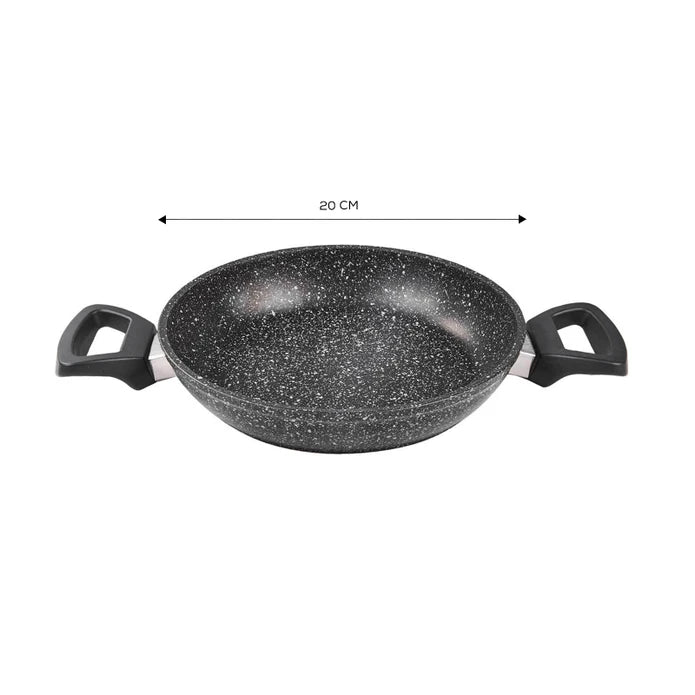 Die Karaca Viento Kochgeschirr-Kollektion bringt Komfort in Ihre Küche. Die spezielle Beschichtung aus natürlichem Granit macht diese einzigartigen Produkte gesund, einfach zu benutzen, leicht zu reinigen und extrem haltbar. Die Töpfe und Pfannen von Karaca Viento sind 7-mal widerstandsfähiger gegen Kratzer im Vergleich zu gleichwertigen Produkten. Sie können die Viento Bio-Granit-Kollektion zum Kochen von Fleisch, Gemüse, Nudeln, Reis, Pfannkuchen und allen anderen Gerichten verwenden, die Sie mögen. Die natürliche Granitbeschichtung sorgt dafür, dass der Geschmack besser zur Geltung kommt, und hilft Ihnen, köstliche Mahlzeiten für Ihre Familie, Ihre Freunde oder einfach für sich selbst zuzubereiten! Die schmutzabweisende Außenbeschichtung verhindert das Entstehen von Flecken auf der Außenfläche des Topfes. Die Innenbeschichtung ist antihaftbeschichtet, also fleckenunempfindlich. Der Topf ist hitzebeständig und hilft Ihnen, mit wenig Aufwand und Energie viel zu erreichen. Der Glasdeckel ist aus hochwertigem, gehärtetem Glas gefertigt, das extrem langlebig ist. Sie können einfach durch den transparenten Deckel schauen, um den Kochvorgang zu verfolgen. Das Produkt ist spülmaschinenfest, wir empfehlen jedoch die Reinigung von Hand, damit es länger hält. 2 Jahre Garantie. Nicht für die Verwendung auf Induktionskochfeldern geeignet