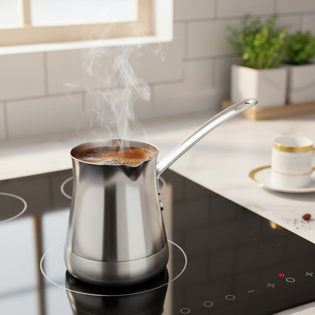Genießen Sie Ihren Kaffee auf authentische Weise – mit dem Karaca Win Kaffeekännchen-Set aus Edelstahl. Dieses 2-teilige Set mit praktischem Stiel ist ideal für die Zubereitung von türkischem Mokka oder klassischem Kaffee.