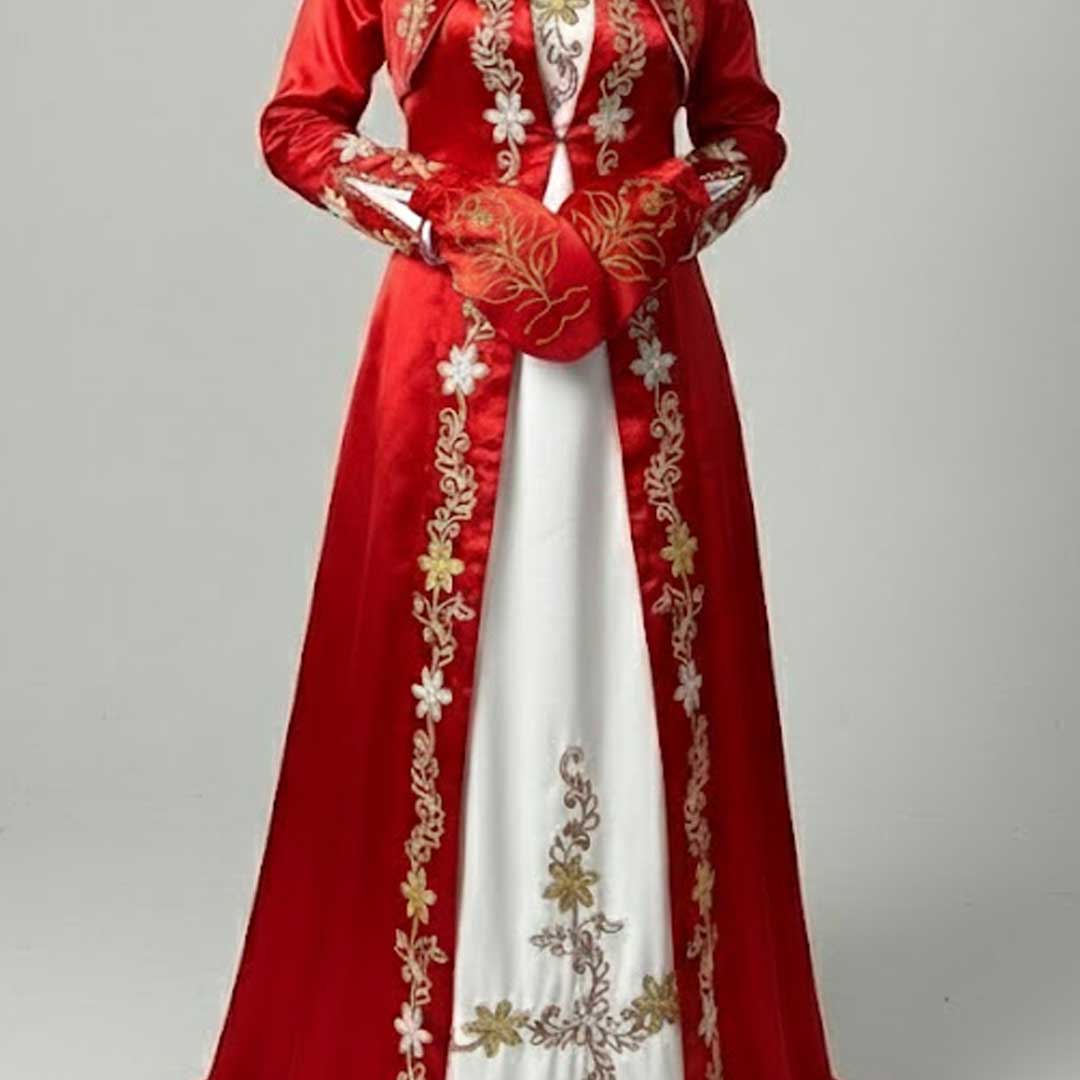Hergestellt aus glänzendem, rotem Satin mit goldfarbenem Glitzerdruck in floralen Mustern – sie verleihen der Trägerin einen traditionellen und zugleich festlichen Look.