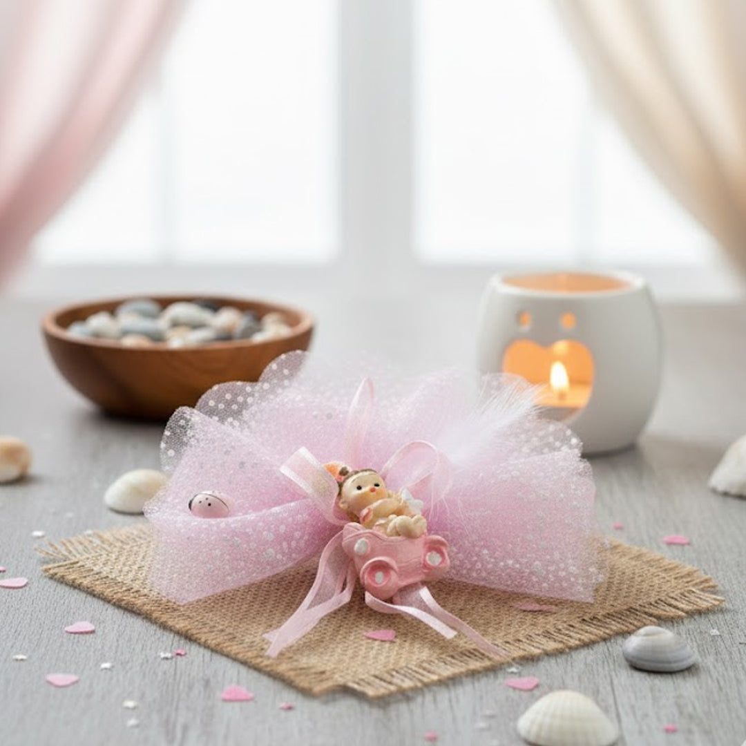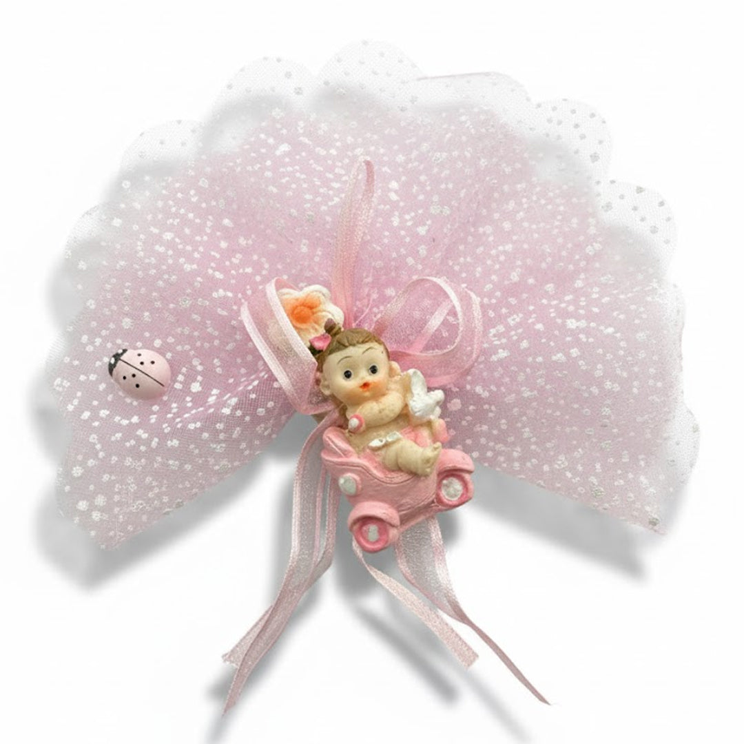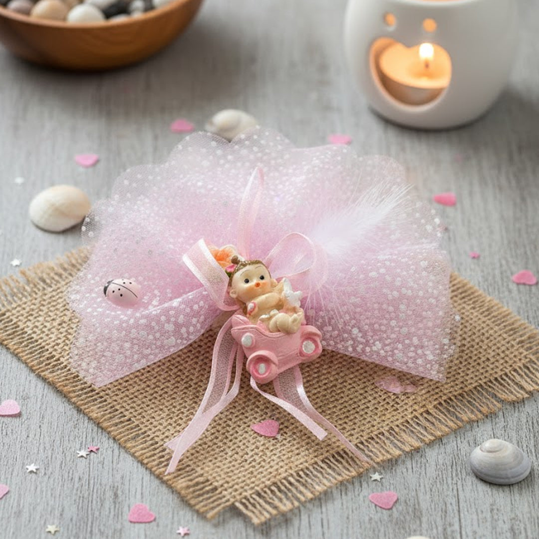 Diese süsse magnetische Dekofigur zeigt ein fröhliches Baby im rosa Auto – ein liebevolles Detail für jede Babyfeier oder als Gastgeschenk zur Geburt eines Mädchens.
