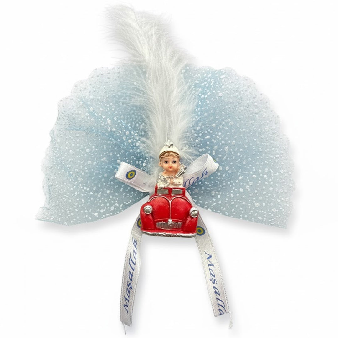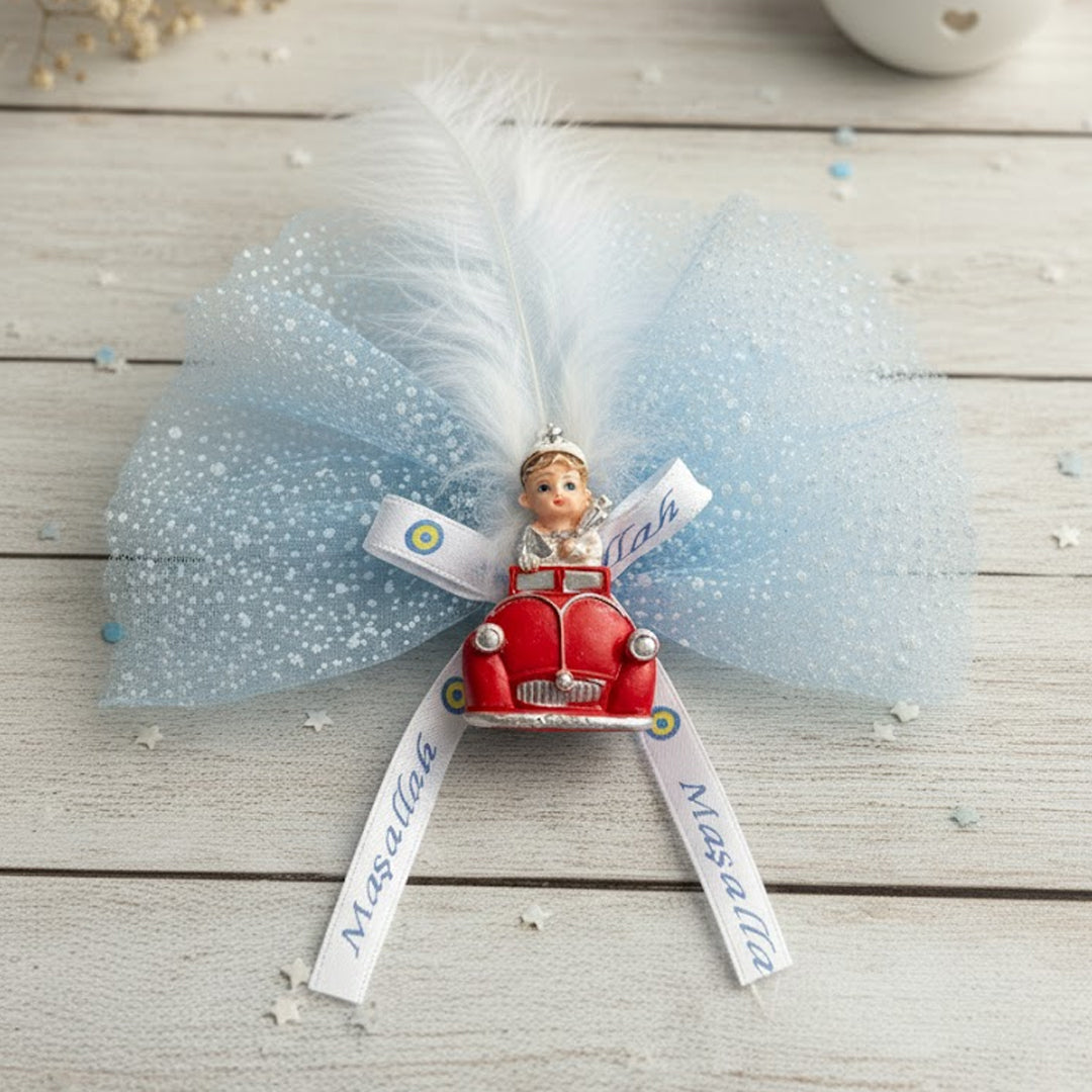Diese charmante magnetische Sünnet-Dekoration zeigt einen fröhlichen Jungen in einem roten Auto, geschmückt mit einer hellblauen Tüllschleife, einem weissen Federdetail und Maşallah-Bändern als Schutzsymbol.