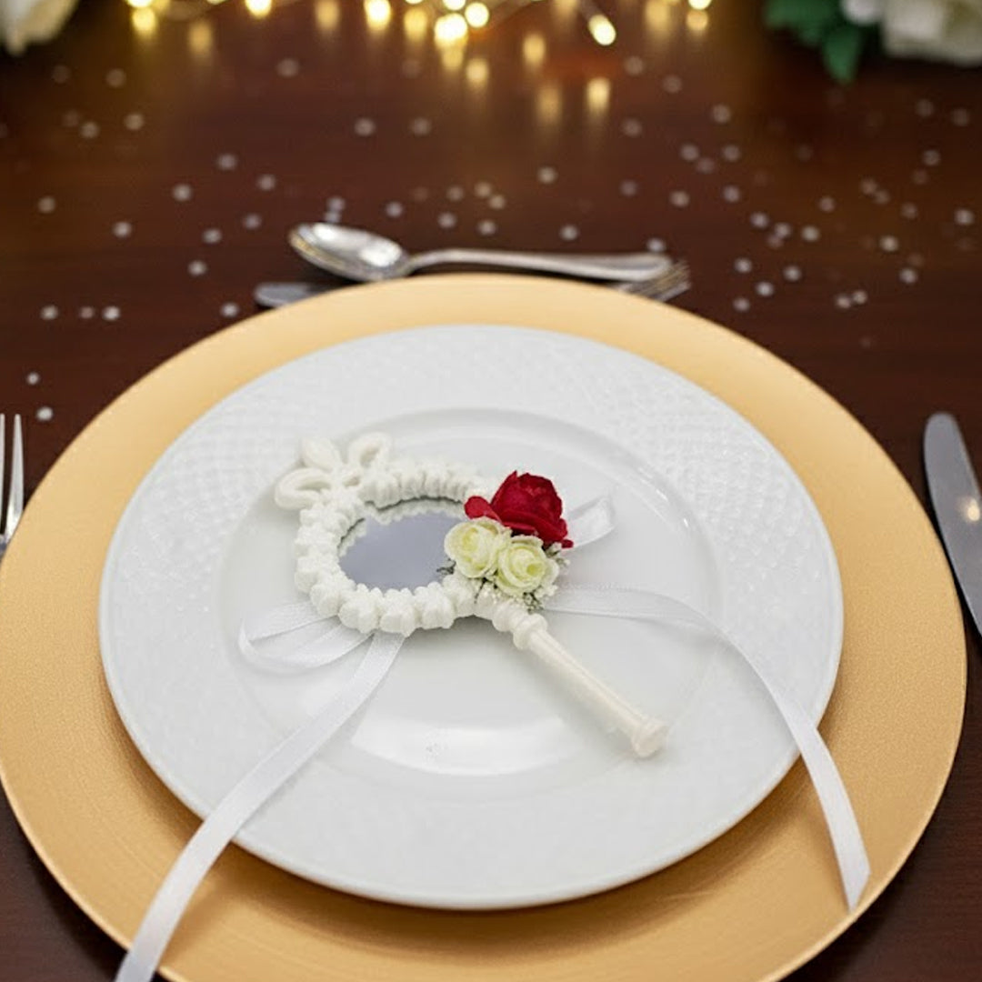 Dank des integrierten Magnets lässt sich das Accessoire einfach an Kühlschränken oder Metalloberflächen befestigen – eine bleibende Erinnerung an Ihren besonderen Tag.