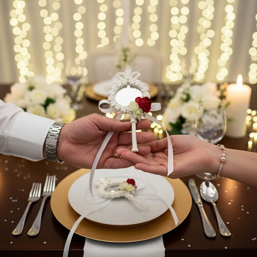 Dieser elegante magnetische Mini-Spiegel ist ein wunderschönes Andenken für besondere Anlässe wie Hochzeit, Verlobung oder Henna-Abend.