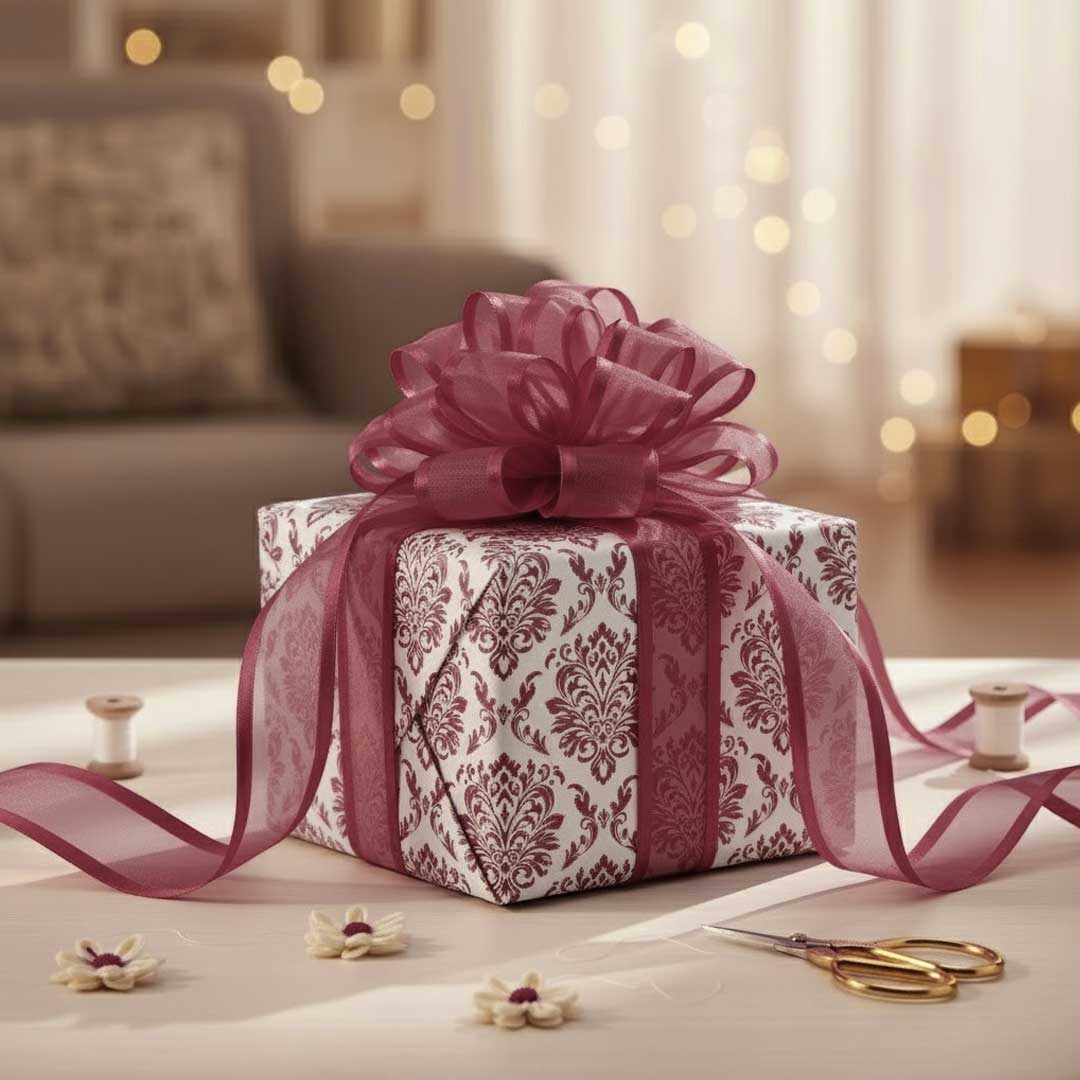 Dieses elegante Organza-Satinband in Bordeauxrot vereint modernen Glanz und feminine Eleganz.