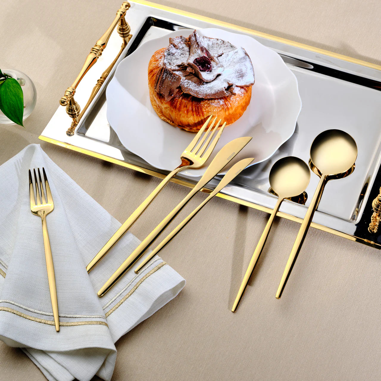 Das Orion Gold Besteckset ist die ideale Wahl für elegante Tischarrangements. Gefertigt aus hochwertigem Edelstahl, besticht es durch seine glänzende Goldoptik und Langlebigkeit. Die ergonomisch gestalteten Griffe sorgen für angenehmen Halt, während die polierte Oberfläche dem Set eine edle Ausstrahlung verleiht. Perfekt für festliche Anlässe oder den täglichen Gebrauch, kombiniert dieses 84-teilige Set Funktionalität mit zeitloser Eleganz.