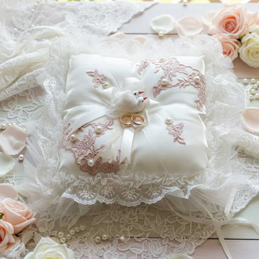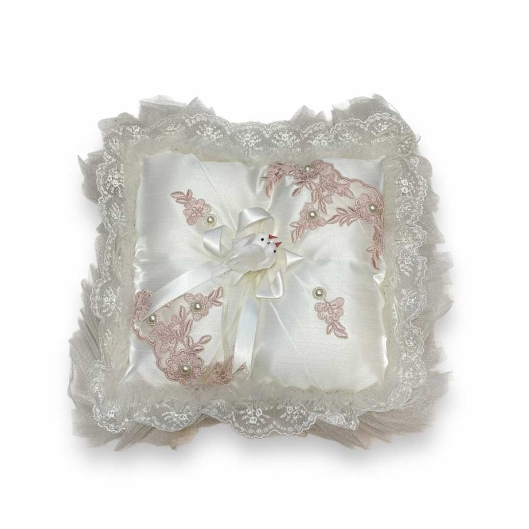 Dieses wunderschöne, quadratische Verlobungskissen ist das perfekte Accessoire für jede Verlobungs- oder Hochzeitszeremonie. Das Kissen besteht aus edlem cremefarbenem Satin und ist mit zarter Spitze, roséfarbenen Stickapplikationen und kleinen Perlendetails verziert. In der Mitte sitzen zwei symbolische weiße Tauben, die Liebe und Verbundenheit darstellen. Der elegante Spitzenrand rundet das romantische Design ab und verleiht dem Kissen eine besonders edle Note.