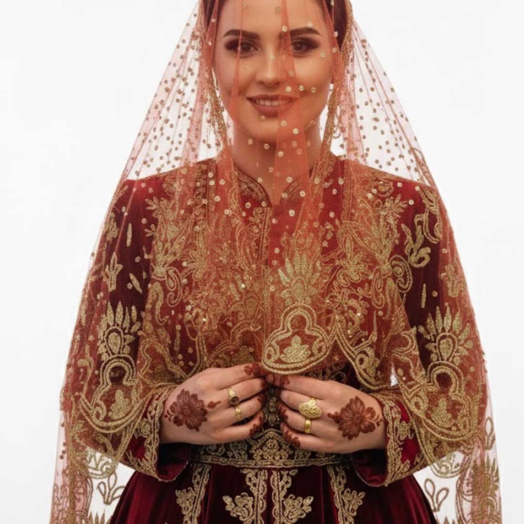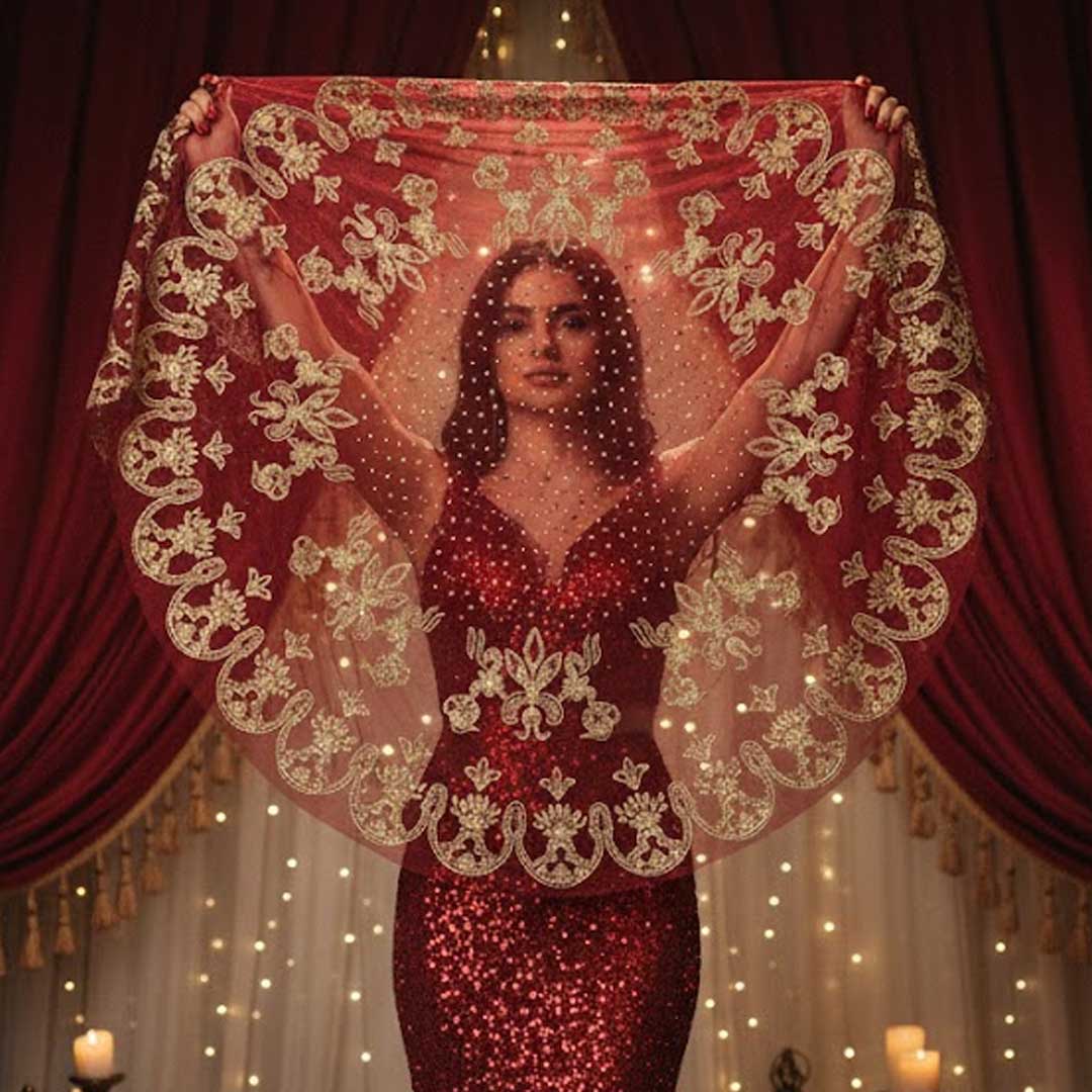 Die funkelnden Ornamente symbolisieren Freude und Feierlichkeit und machen diesen Schleier zu einem unverzichtbaren Accessoire für den Henna-Abend.