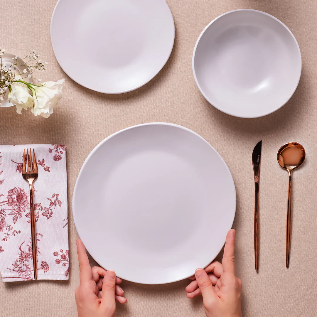 Das Scarlet 18-teilige Tafelservice für 6 Personen vereint zeitlose Eleganz mit modernem Design. Die harmonische Farbkombination und die feinen Details machen dieses Set zu einem stilvollen Highlight für jede Tafel. Es umfasst 6 Essteller (27 cm), 6 Dessertteller (22 cm) und 6 Schalen (16 cm). Gefertigt aus hochwertigem Material, bietet es eine langlebige Qualität und ist ideal für den täglichen Gebrauch sowie besondere Anlässe.