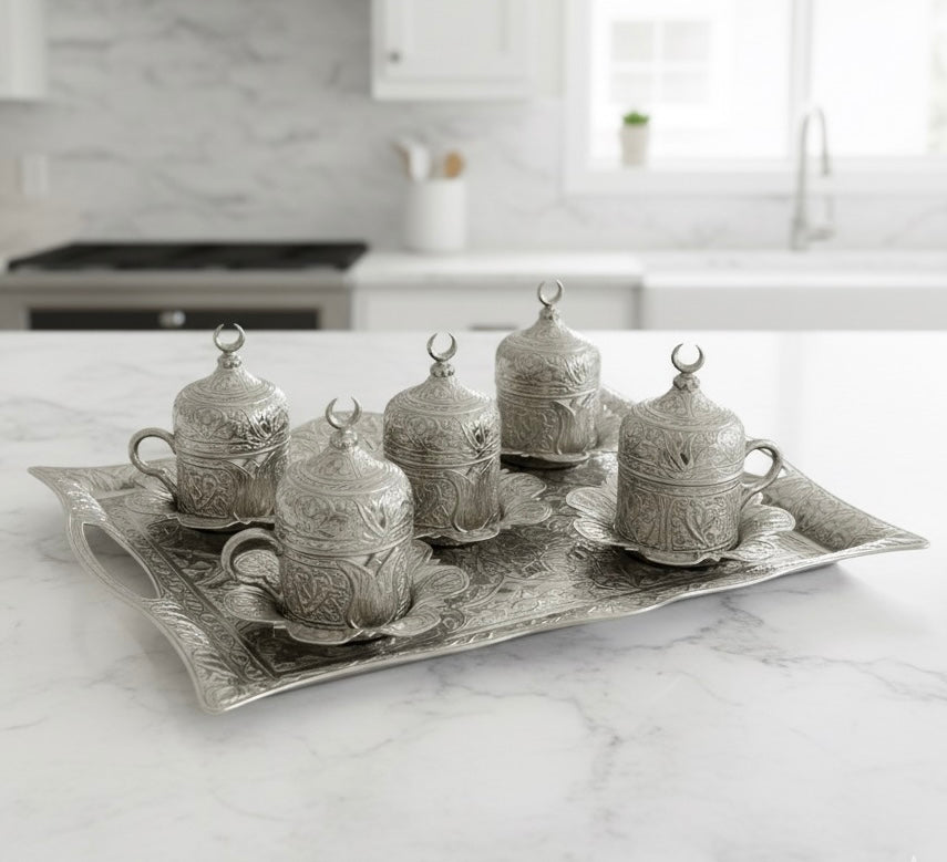 Die silberfarbene Optik verleiht dem Set einen modernen, luxuriösen Look, während die Lale-(Tulpen) Muster eine traditionelle Note hinzufügen. Jede Tasse ist mit einem Deckel versehen, der das Getränk länger warm hält und vor Verschütten schützt.