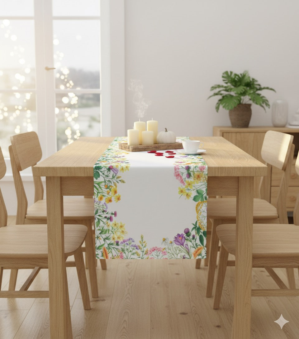 Seine florale Gestaltung macht ihn perfekt für Frühlings- und Sommerdekorationen oder romantische Tafelformen. Ob Esstisch, Serviertisch oder Beistelltisch – dieser Läufer bringt eine freundliche, einladende Atmosphäre in Ihren Wohnbereich.