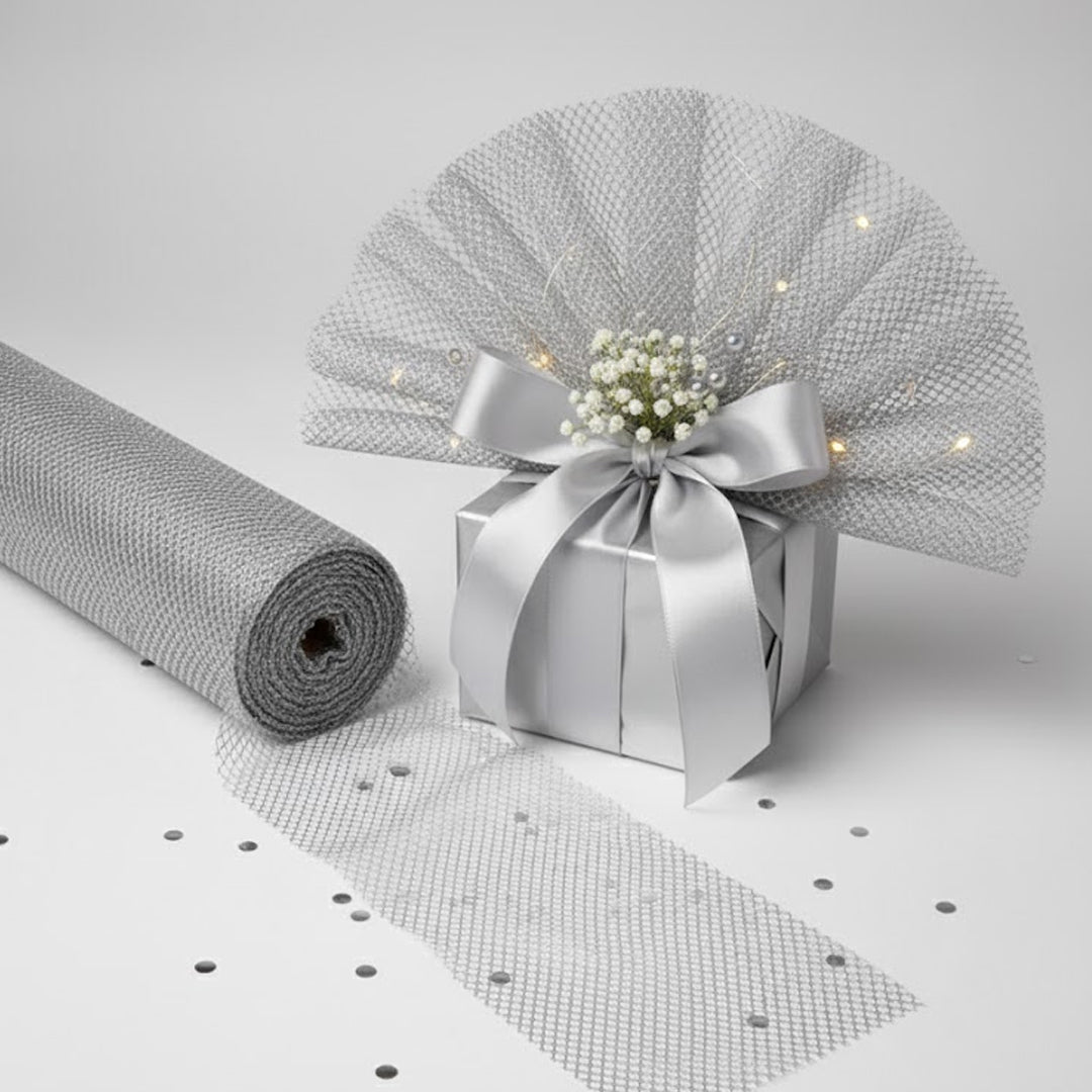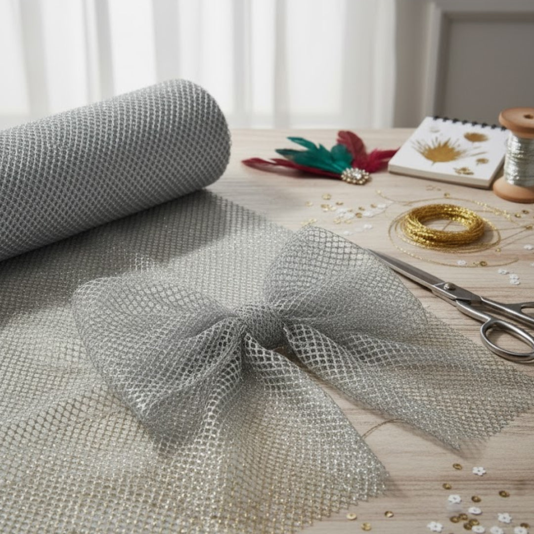 Die grobe, netzartige Struktur wird von feinen Lurex-Fäden durchzogen, die das Licht wunderschön reflektieren und jedem Projekt einen eleganten, festlichen Touch verleihen.