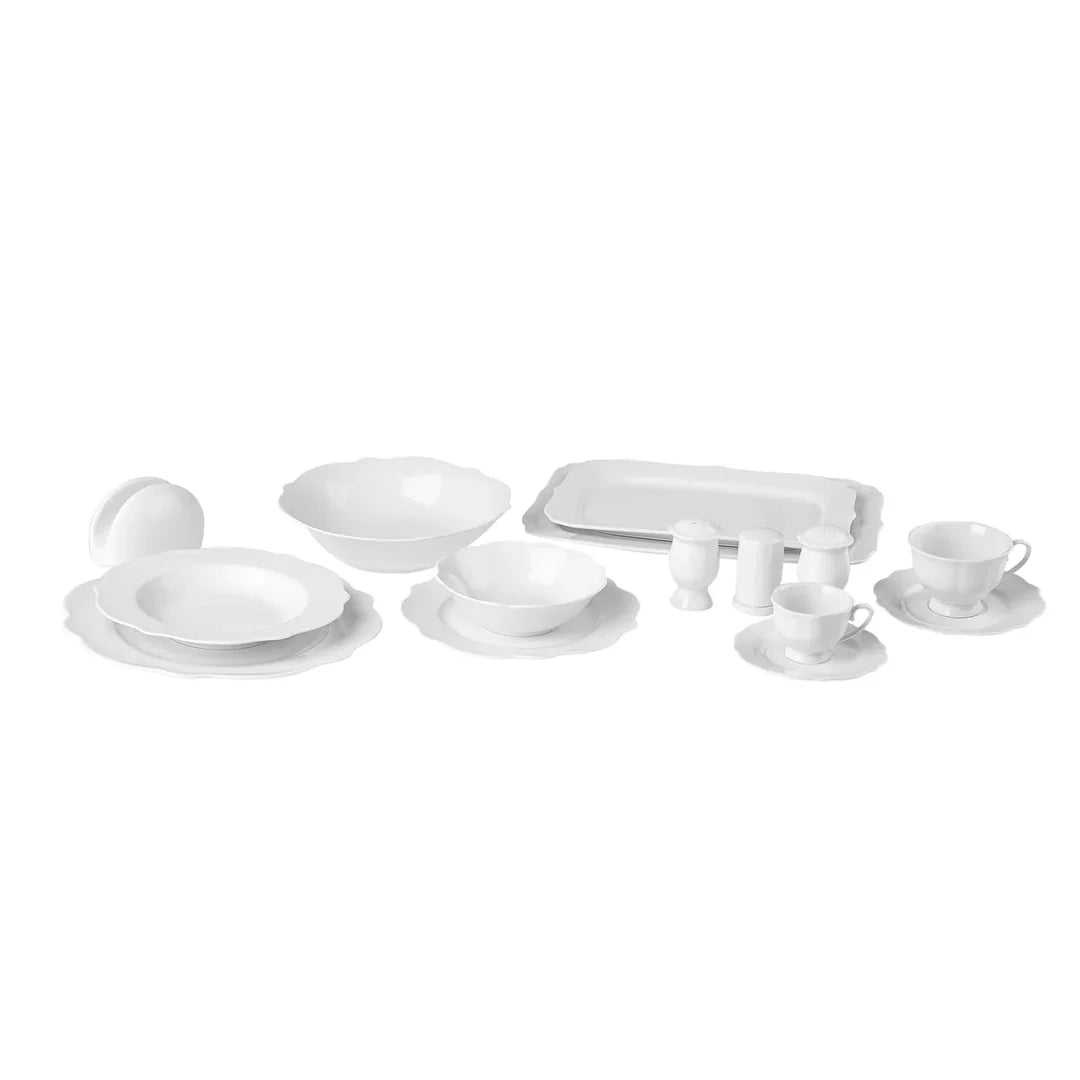 Das Vera White Tafelservice, 59-teilig vereint zeitlose Eleganz mit funktionaler Qualität. Gefertigt aus hochwertigem Porzellan, besticht es durch sein schlichtes, modernes Design in edlem Weis. Dieses Set eignet sich perfekt für stilvolle Dinner, festliche Anlässe oder den täglichen Gebrauch. Es umfasst 12 grosse Essteller, 12 Suppenteller, 12 Dessertteller, 6 Schüsseln, 3 kleine Servierplatten, 1 große Servierplatte, 1 Suppenschüssel mit Deckel, 2 Salzstreuer, 2 Pfefferstreuer, 1 Zahnstocherhalter und 1 Saucenschale. Zudem ist das Service spülmaschinen- und mikrowellengeeignet, was eine einfache Handhabung und Reinigung ermöglicht.
