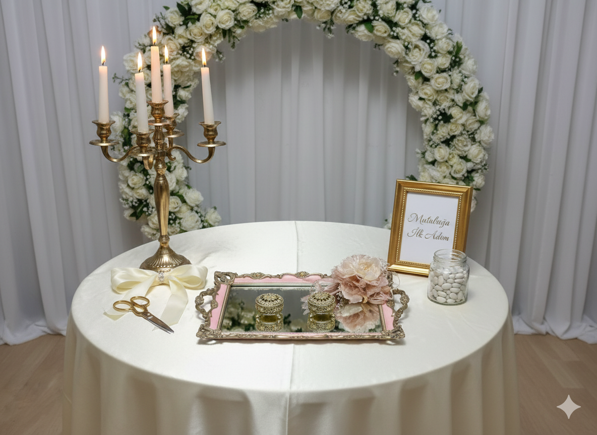 Dieses elegante Verlobungstablett (45 cm x 32 cm) ist die perfekte Bühne für Ihre Ringe. Das Design besticht durch seine luxuriöse Silberoptik und die aufwendige Dekoration: Der gesamte Rand ist mit einer glänzenden Kette aus schimmernden Perlen und funkelnden Strasssteinen (parlak taşlar) verziert.