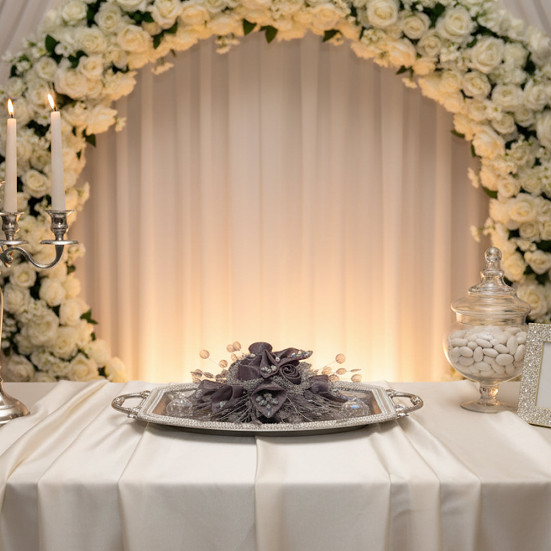 Die spiegelnde Oberfläche setzt Ihre Verlobungsringe und den Scherenmoment perfekt in Szene und sorgt für atemberaubende, märchenhafte Fotos. Nutzen Sie es, um Ihre Ringe und Accessoires stilvoll zu präsentieren und Ihren Gästen einen Hauch von eleganter Tradition zu bieten.