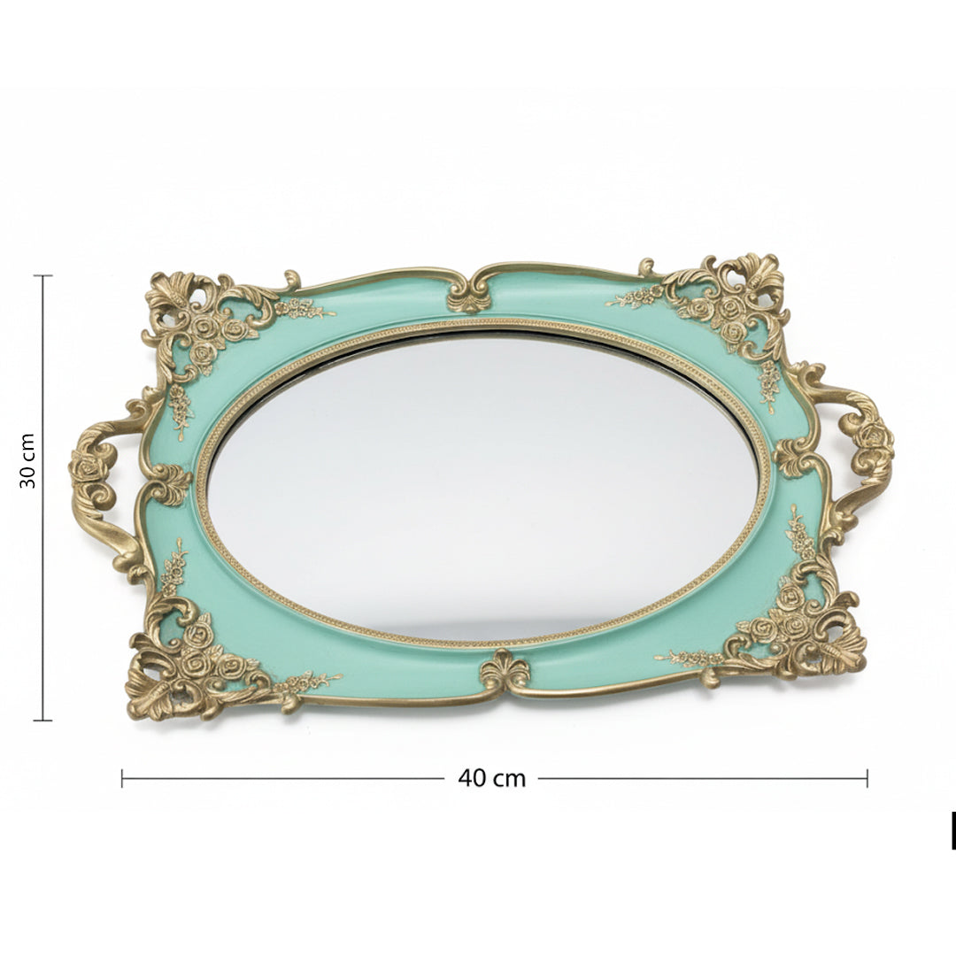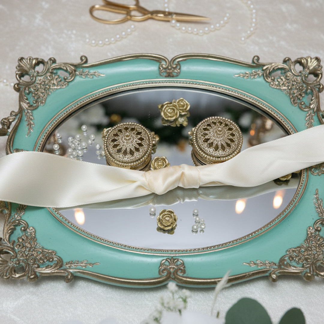 Dieses exklusive Verlobungstablett (40 cm x 30 cm) vereint Vintage-Eleganz mit einem modernen Farbakzent. Der Rahmen in edlem Mint-/Türkisgrün und die reich verzierten Gold-Applikationen machen dieses Tablett zum unbestrittenen Highlight Ihrer Zeremonie.