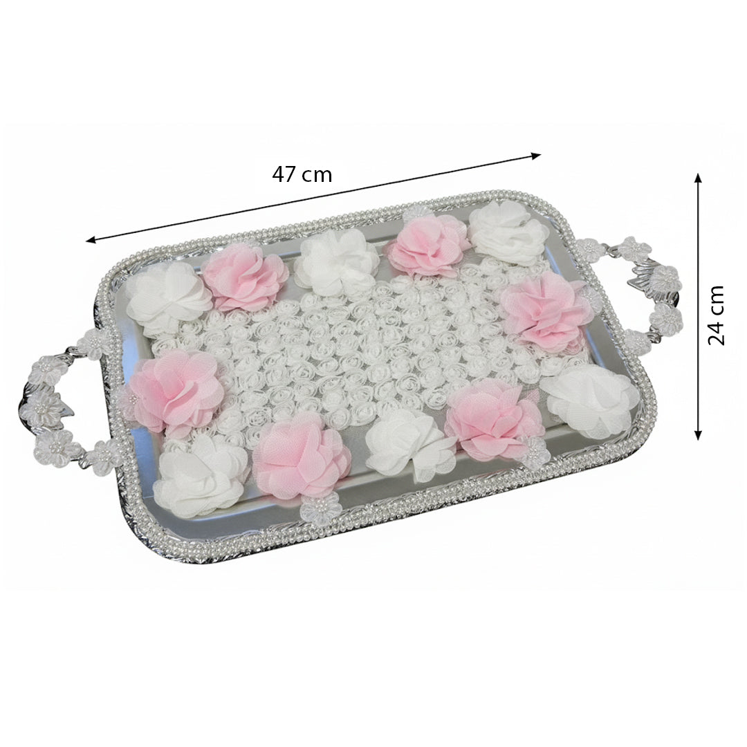Das Herzstück des Tabletts ist die romantische Dekoration aus Stoffrosen: Die gesamte Innenfläche ist liebevoll mit kleinen, weißen Mini-Röschen ausgelegt, die eine weiche, wolkenartige Textur erzeugen. Akzente setzen größere, zarte Rosé und weisse Stoffblüten.