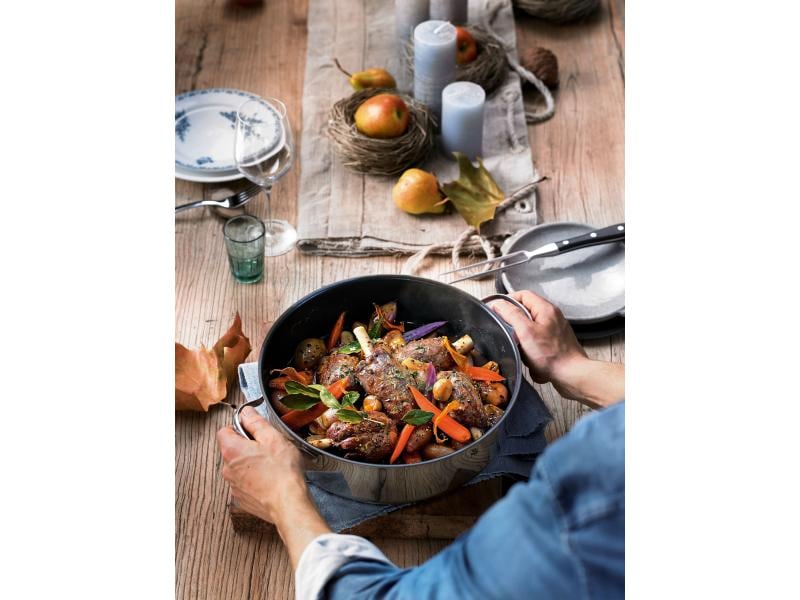 Der Boden der Schmorpfanne leitet und speichert die Hitze optimal, sodass Sie energiesparend kochen können. Die Pfanne mit ergonomischen Griffen ist zudem backofenbeständig. Mit dem breiten Schüttrand giessen Sie den Inhalt mühelos, tropffrei aus. Der Glasdeckel erlaubt Ihnen jederzeit einen Blick auf Ihre Speisen.