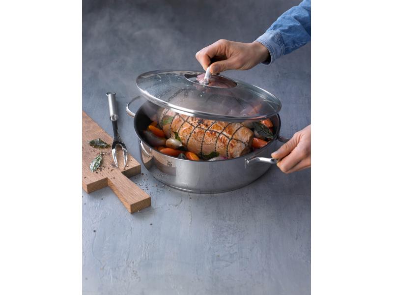 Die WMF Schmorpfanne besteht aus Edelstahl und ist antihaftbeschichtet. So bleibt selbst bei scharfem Anbraten nichts hängen. Die Pfanne können Sie auf allen Herdarten inklusive Induktion einsetzen.