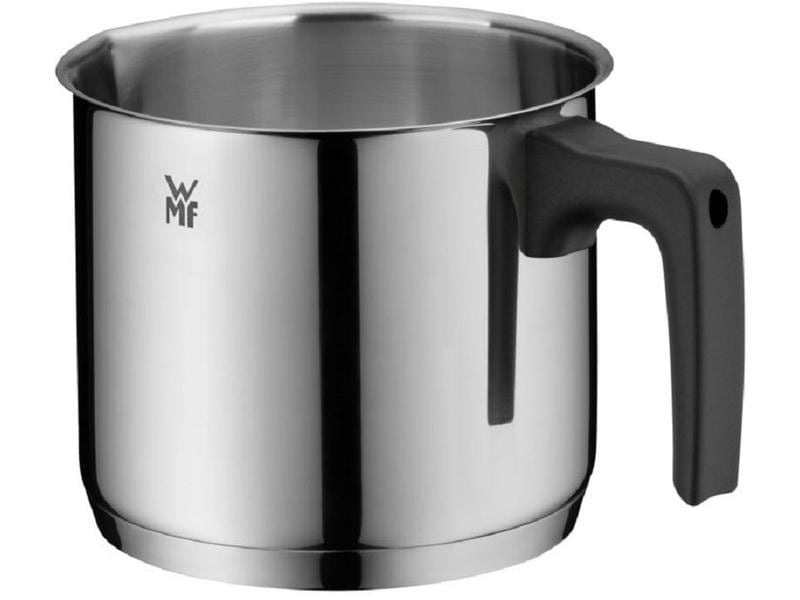 Der Milchtopf mit 14 cm Durchmesser von WMF verfügt über die typische schlanke und hohe Form, die Spritzer auf dem Herd zuverlässig vermeidet. Dabei ist der Milchtopf nicht nur zum Erhitzen von Milch oder zum Zubereiten heisser Schokolade geeignet: in dem kleinen Multitalent gelingen auch Pudding, Griesbrei oder das Anrühren eines Tortengusses mühelos, auch Eier lassen sich darin kochen. Der TransTherm-Allherdboden ermöglicht den Einsatz auf jedem Herd, der wärmereduzierende Bakelitgriff sorgt für hohen Komfort, die spezielle Schnaupe gewährleistet tropffreies Ausgiessen. Gefertigt aus strapazierfähigem und sehr pflegeleichtem Cromargan: Edelstahl Rostfrei – für viele Jahre Kochvergnügen.