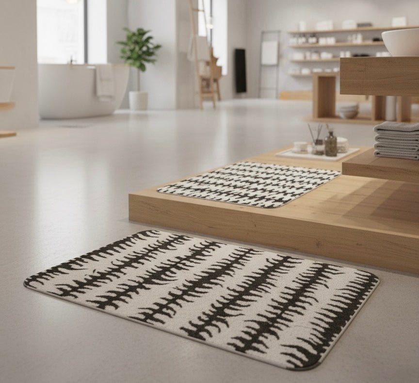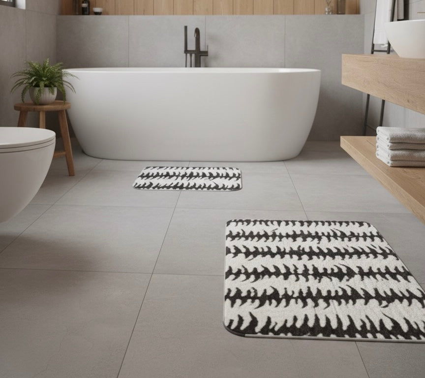 Verleihen Sie Ihrem Badezimmer mit dem 2-teiligen Zebra-Muster Badematten-Set eine moderne und stilvolle Note. Dieses Set besteht aus zwei Matten in den Größen 60 x 100 cm und 50 x 60 cm, die durch ihr auffälliges Zebramuster überzeugen. Gefertigt aus hochwertigem Kunstleder mit einer Florhöhe von 12 mm, bieten die Matten ein angenehmes Laufgefühl und sind gleichzeitig besonders pflegeleicht. Dank der rutschfesten Unterseite bleiben sie sicher an ihrem Platz und sorgen für zusätzliche Sicherheit im Badezimmer. Die maschinell gewebte Verarbeitung gewährleistet Langlebigkeit und Strapazierfähigkeit. Zudem sind die Matten waschbar; bitte beachten Sie, dass sie nicht ausgewrungen und liegend getrocknet werden sollten. Mit einem Gewicht von 1250 g/m² sind sie robust und dennoch komfortabel. Dieses Set eignet sich ideal für alle, die ihrem Badezimmer einen modernen Touch verleihen möchten.